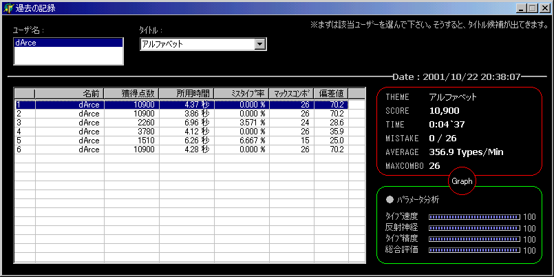 また、豊富な点数計算方式で毎回違った感覚を楽しめます。 何回はプレイしたら、現在までのログ(履歴)を見る事もできます。前回同様、自分が、何時何分にゲームをして、 どのくらいの点数や状況だったかを一目瞭然!登録しているユーザーが他にもいればデータを比較したり、 偏差値で数値化されたデータを楽しめます。尚、グラフ化もできます。 友達や家族で誰が一番偏差値が高いか?などのバトルで競う事もできます。 複数人数登録可能で、個人事に設定を施す事ができます。