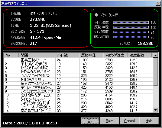 タイピングが終わった後には次のように詳細なデータが表示されます。 各種問題事のデータや、かかった時間などの細かいデータが出ます。「Excel」があれば「Save」しておいて見る事もできます。